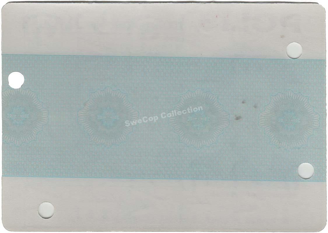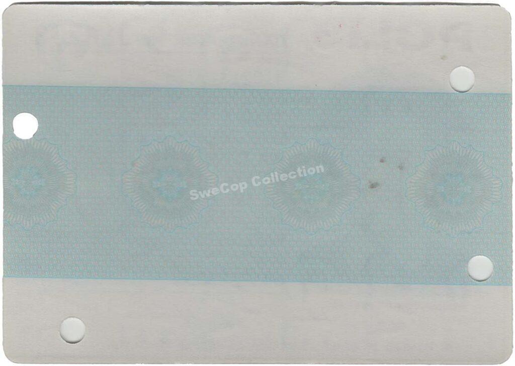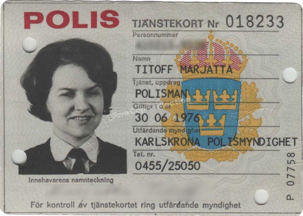 Denna bild på den första papperslegitimationen som kom 1971 har SweCop fått låna av Marjatta Titoff. Legitimationen har en plastad baksida men framsidan känns som papper. Storlek ca 105 x 74 mm. Marjatta har en intressant sida om sin poliskarriär  på sidan ”Mitt Polisliv”: https://ateljetitoff.se/mitt-polisliv/